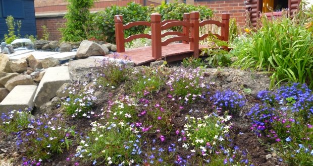 This couple has a front and back garden which are covered in a host of evergreen and deciduous plants. The back garden has a stunning water feature which is surrounded by a rockery, plants and ornaments. A bridge which spans the length of the pond leads to a playhouse which has been seamlessly incorporated into the design of the garden. The garden also features a decking area which seating.